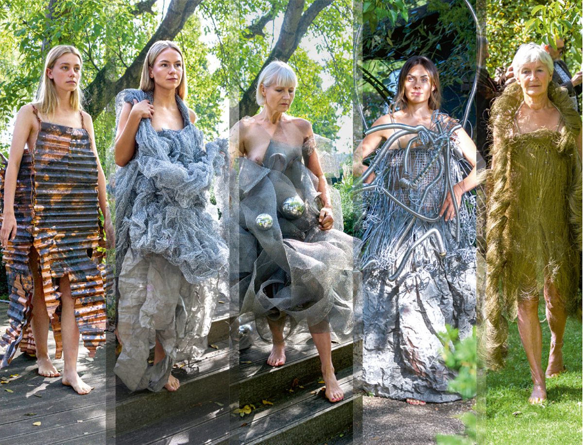 Es geht der Würzburger Bildhauerin Angelika Summa nicht um Haute Couture. Höchstens ironisch. Was in der Performance Ende September im Garten des kunstsinnigen Vereins „Hyazinth“ in Thierach-Rödental bei Coburg nach extravaganter Mode aussehen mag, ist (für die Jahreszeit zugegeben etwas „erfrischende“) Kunst, sind Skulpturen, im Wortsinn sogar „untragbare“ KörperSkulpturen, die den Trägerinnen bei jeder Regung womöglich empfindliche Verletzungen zufügen könnten. Die body-sculptures sind bisweilen sogar bewußt „unmenschlich“ und für den höllischen Zustand unserer Welt geradezu paradiesisch.