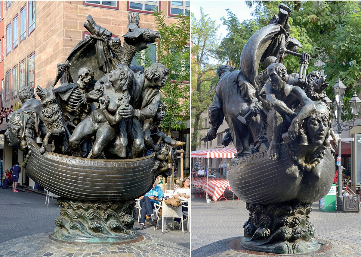 „Narrenschiff“ von Jürgen Weber. Die „umstrittene“ Skulptur war eigentlich als Brunnen konzipiert; sie wurde 1988 auf einem namenlosen Platz, unweit des Hauptmarktes in Nürnberg, trocken aufgestellt.